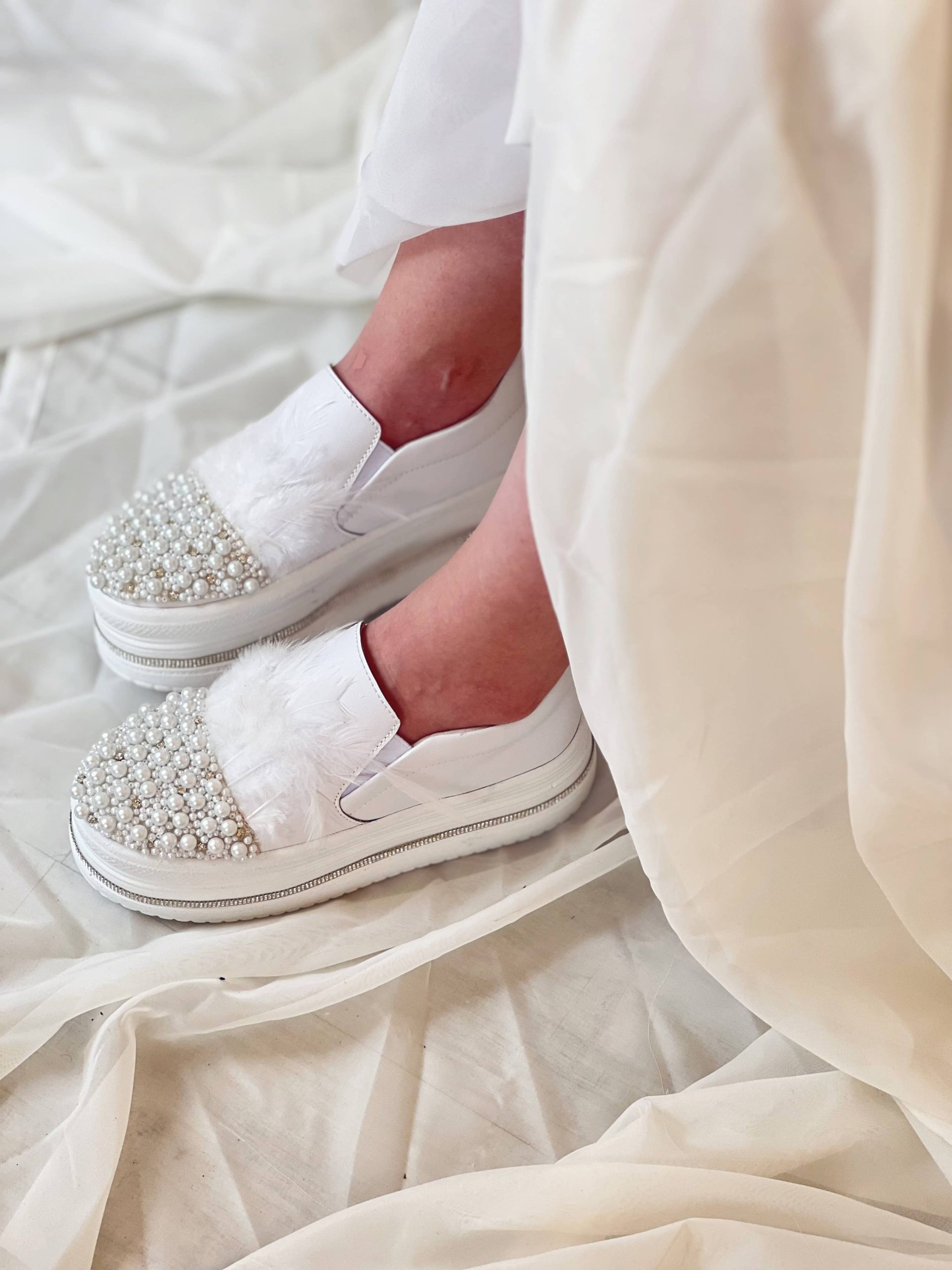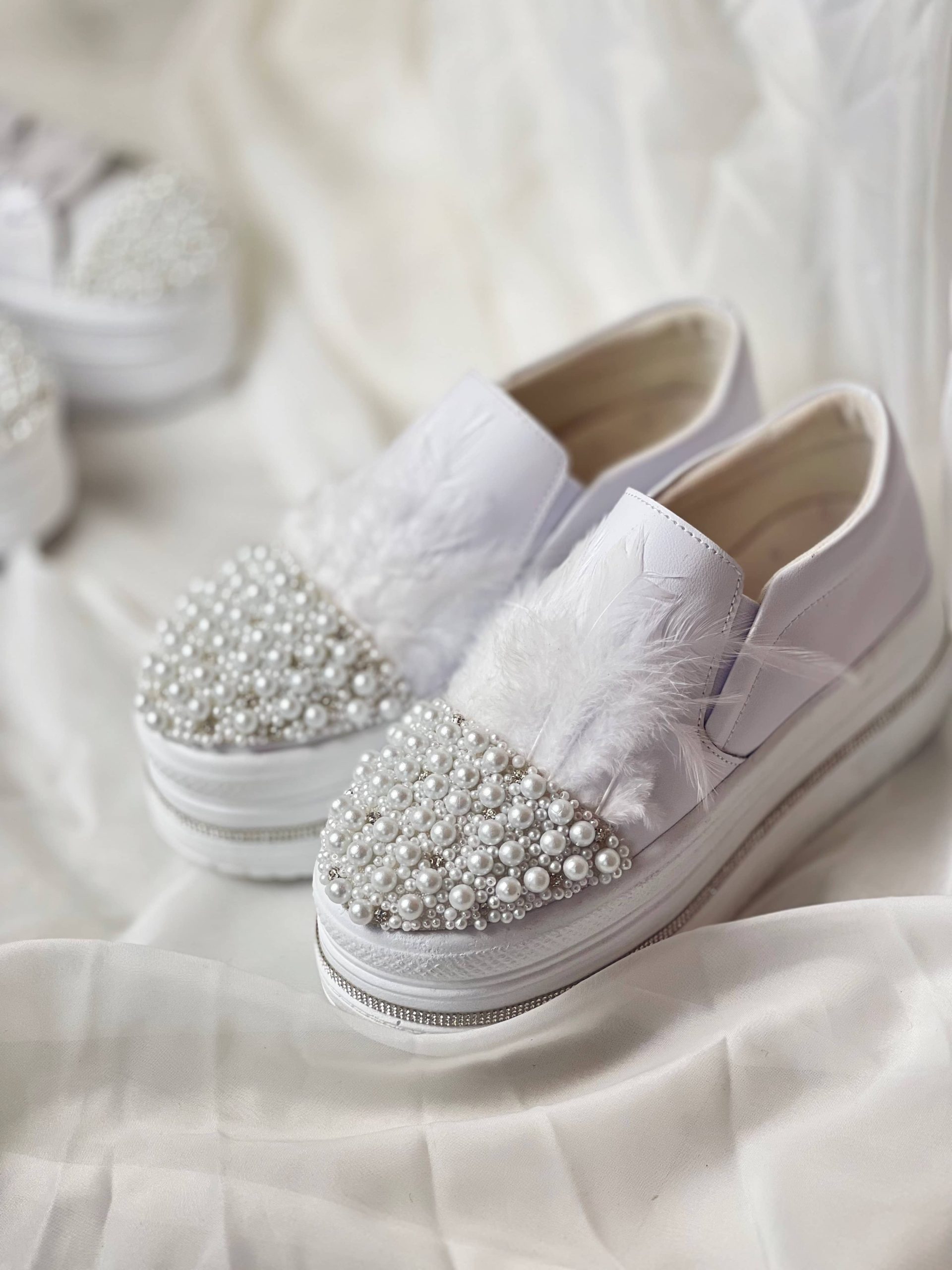 لوفر عروس زیبا و شیک با زیره ی pu پنج سانت که باعث شده علاوه بر زیبایی راحتی غیر قابل توصیفی داشته باشه این کفش با مروارید و پر مزین شده